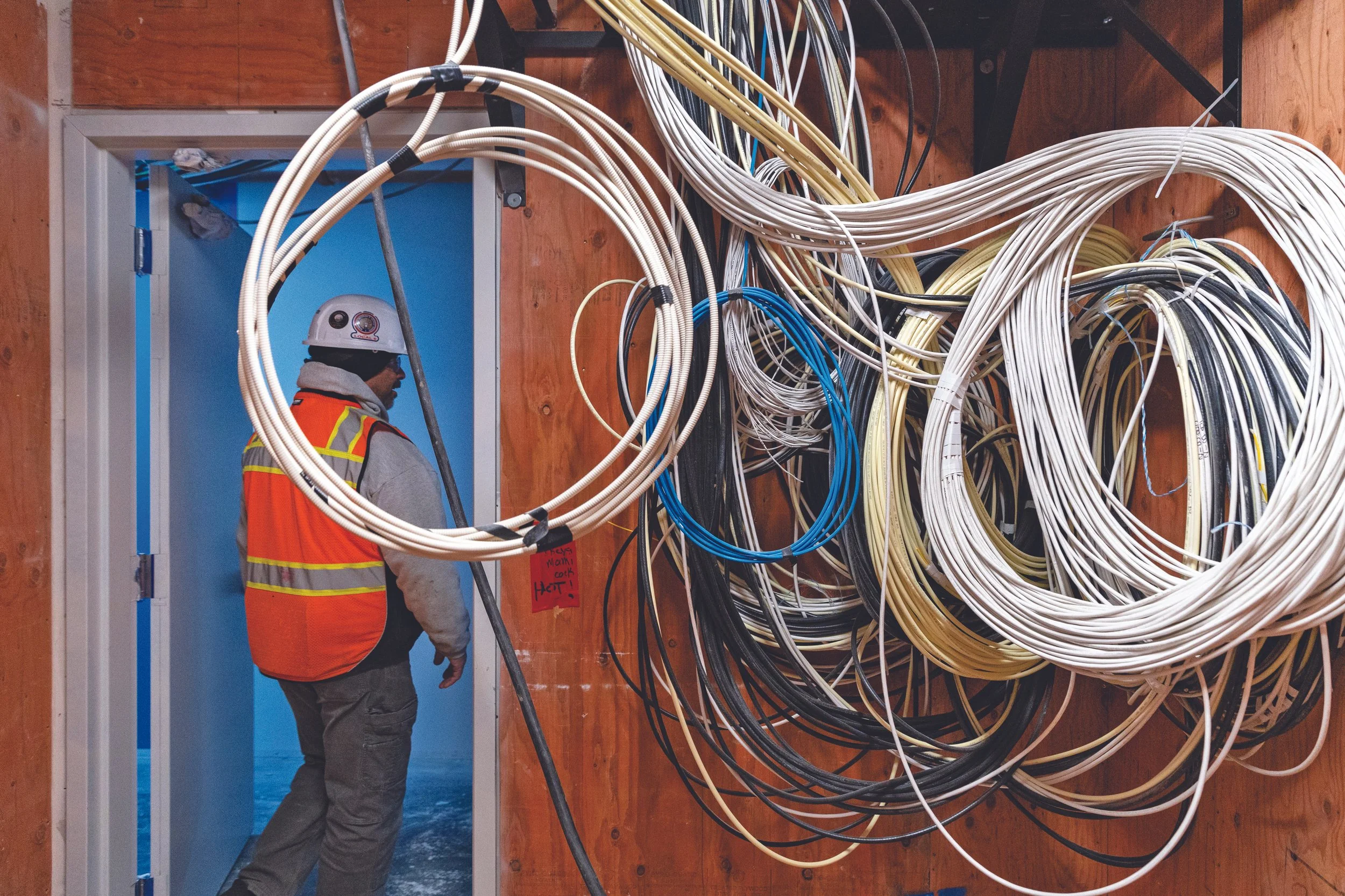 Wires hang from the ceiling of a project under construction at 730 Stanyan Street in San Francisco in March while an IBEW Local 6 member is seen in the background. | Photo credit: Jana Ašenbrennerová