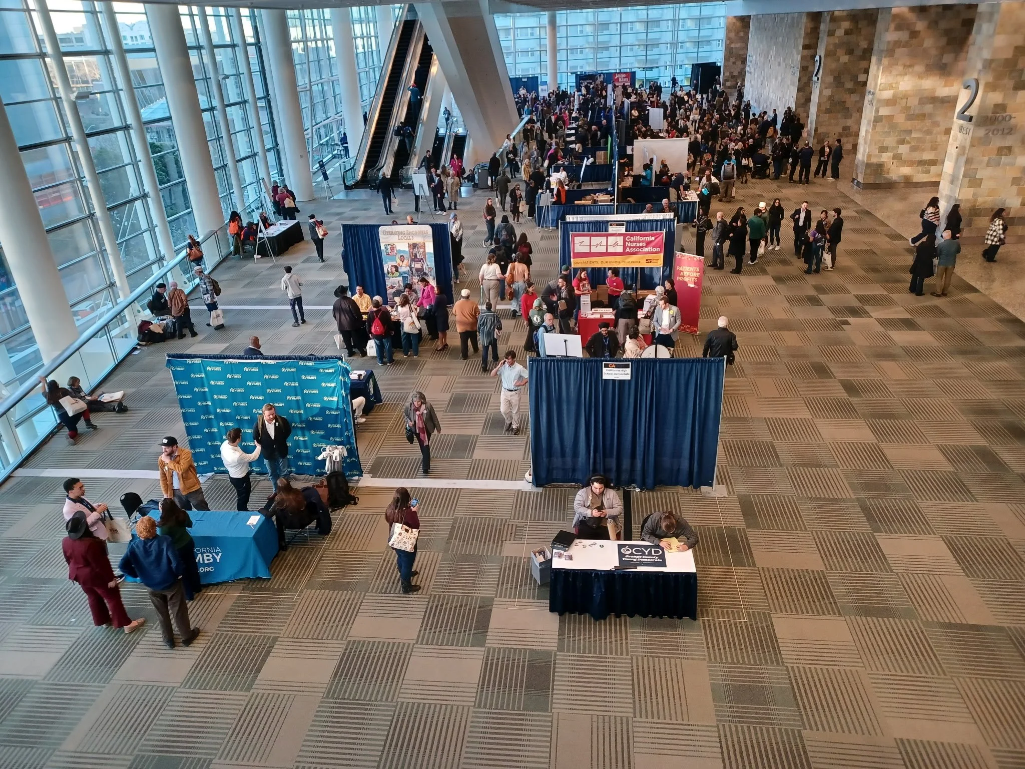 A view from above at Moscone Center shows a range of organizations’ booths at the 2026 California Democratic Convention. | Photo: Jessica Zimmer