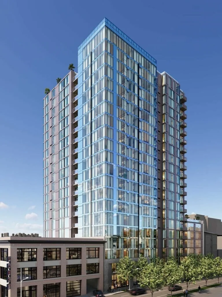 The 22-story apartment tower will deliver 303 new homes between Polk and Larkin streets, including 101 on-site affordable units, along with a 4,000-square-foot public childcare center. Martin Building Company is developing the project.