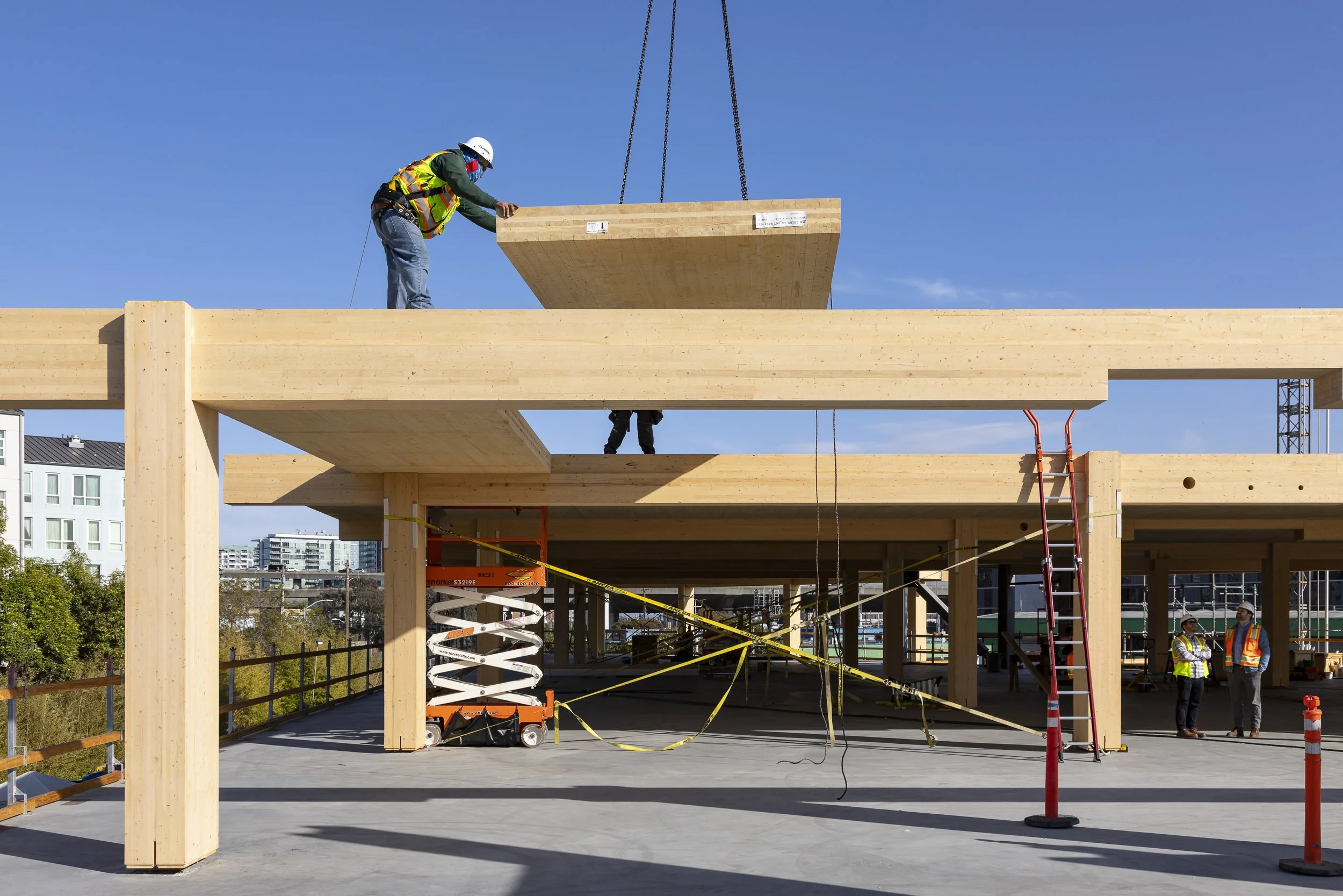 “These jobs involve installing quite a bit of [rebar] and structural concrete,” Reyes said. “The mass timber producers protect the wood by shipping it out covered in plastic sheets. But ultimately, indoors, they want the material to be seen.”